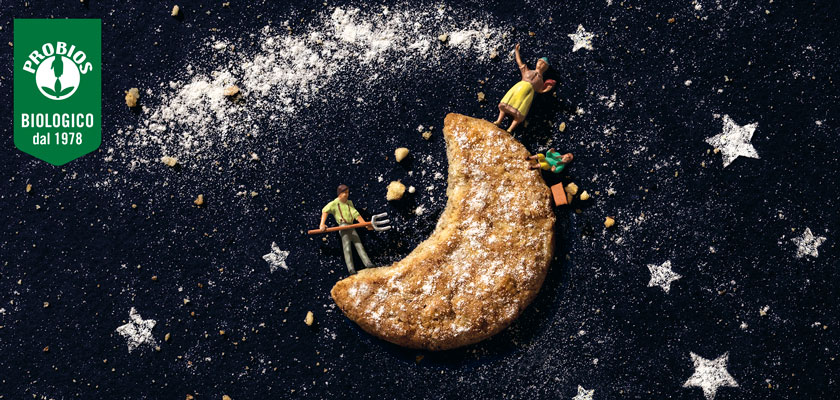 Probios has always been supporting and promoting a precise vision of the world and of the future, in line with the values that the landing celebration renews. Against the backdrop of an ever-changing food universe, the recent institutional campaign tells the evolution of conscious nutrition, identifying it as the key to a better tomorrow and addressing an attentive consumer, looking for a new, more true and sincere contact with the surrounding nature. The claim, PURE GOODNESS TO ZERO COMPROMISE, is thus at the center of a space image: a farmer works with a pitchfork on the ground of a half moon formed by a biscuit, together with his family. The crumbs that come off go to join a galaxy in the background forming new stars. The return to the earth creates new possibilities.
